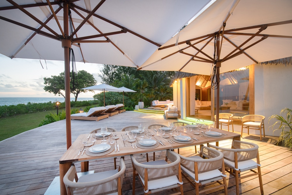 La Villa Miti vous plonge dans un cadre de tranquillité avec une terrasse privée de 57 m² et une salle de bain ouverte sur l’extérieur avec une douche panoramique et une baignoire en plein air.